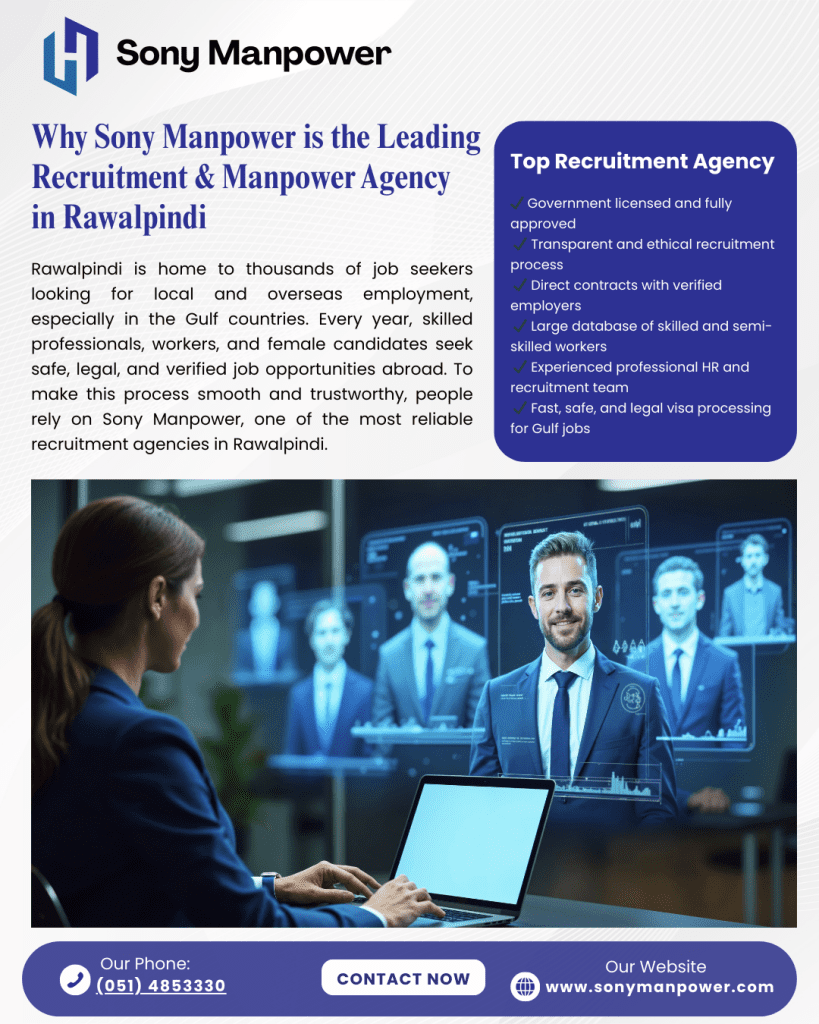This guide covers why Sony Manpower is the best recruitment agency of Rawalpindi for female candidates, a leading manpower agency in Rawalpindi, and one of the best overseas recruitment agencies in Rawalpindi, with special focus on Gulf recruitment opportunities.
